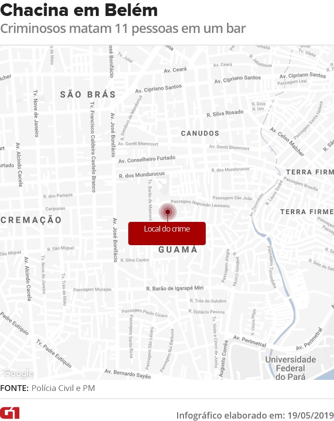 Crime aconteceu por volta de 16h de domingo (19), no bairro do Guamá. Segundo testemunhas, sete homens chegaram no bar atirando. 11 pessoas morrem em chacina no bairro do Guamá em Belém A Polícia Civil do Pará investiga uma suposta relação entre a chacina que vitimou 11 pessoas dentro de um bar no bairro do Guamá, em Belém, no último domingo (19), com o tráfico de drogas. Segundo testemunhas, sete homens chegaram ao local atirando. O Instituto Médico Legal (IML) já identificou 9 das 11 vítimas. Uma pessoa ficou ferida e está sob proteção policial. O crime aconteceu por volta das 16h. De acordo com as investigações, uma festa ocorria no local quando sete homens encapuzados chegaram em uma moto e três carros e dispararam contra as vítimas. Quase todas foram baleadas na cabeça. Dos 11 mortos, 6 são mulheres e 5 são homens. Veja os nomes de 9 das 11 vítimas da chacina no Guamá: Maria Ivanilza Pinheiro Monteiro, de 52 anos, a dona do bar Leandro Breno Tavares da Silva, de 21 anos Márcio Rogério Silveira Assunção, de 37 anos Sérgio dos Santos Oliveira, de 31 anos Tereza Raquel da Silva Franco, de 33 anos Samira Tavares Cavalcante, de 35 anos Flávia Teles Farias da Silva, de 32 anos Paulo Henrique Passos Ferreira (com idade não divulgada) Meire Helen Sousa Fonseca (idade não divulgada) Um vídeo feito logo após o massacre mostra as vítimas baleadas e caídas pelo estabelecimento, que tinha autorização para funcionar. Uma mulher estava deitada em cima do balcão do bar. A Divisão de Homicídios da Polícia Civil investiga o crime e realiza buscas aos criminosos. Ninguém foi preso até o início da manhã desta segunda-feira (20). Além da possível relação com o tráfico de drogas, a polícia também não descarta outras hipóteses para o crime, já que na semana passada três policiais militares foram assassinados em Belém. Local da chacina: crime ocorreu em bar no Guamá, bairro pobre de Belém Vitor Sorano/G1 Bairro recebeu Força Nacional O Guamá é o bairro mais populoso de Belém e um dos sete da região metropolitana da capital paraense que receberam, em março, a Força Nacional, devido aos elevados níveis de criminalidade. Ao todo, 274 agentes fazem o patrulhamento nesses locais, batizados de territórios de pacificação pelo governo estadual. Segundo a gestão Helder Barbalho (MDB), houve queda no número de mortes no primeiro mês de atuação.